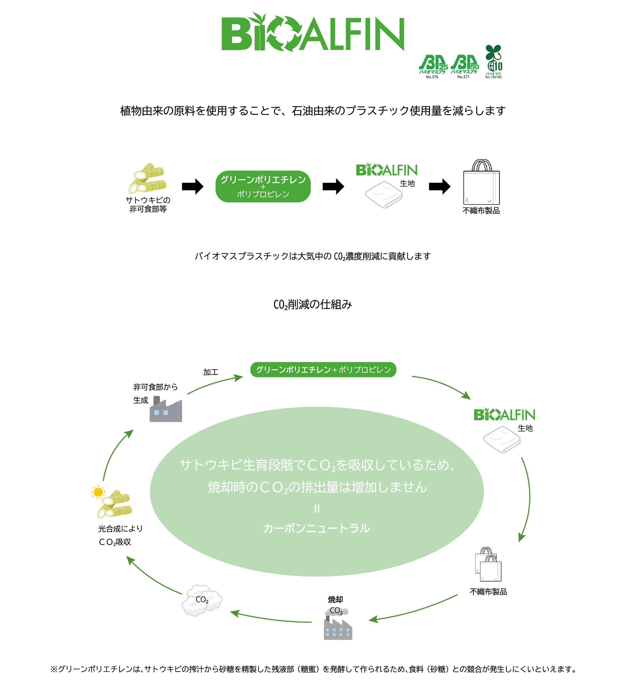 HOME | 植物由来のバイオマス不織布 CO2削減 Environmental measures BiOALFIN 無機物充填剤 バイオマス不織布 生分解性不織布 燃焼時のCO2減少不織布 資源循環システム